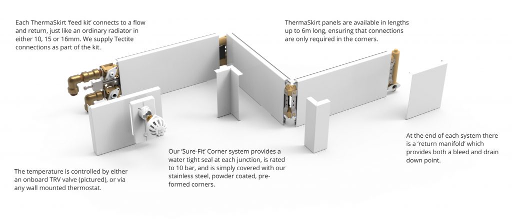 ThermaSkirt es un panel radiante de aluminio disfrazado de zocalo tradicional que emite calor a bajos niveles por todo el perímetro de la habitación, siendo una alternativa perfecta a radiadores y a la calefacción por suelo radiante.
